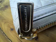 Cartera de piel acolchada con zipper alrededor, tiene compartimentos para 8 tarjetas, billetes y monedas (en el compartimento de monedas le hace falta la jaladera del zipper, en la última foto se aprecia).Usada con signos normales.