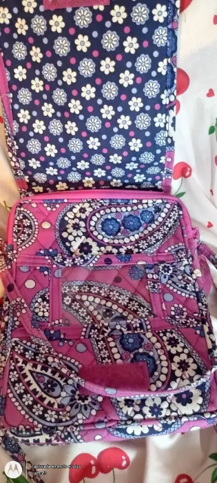 Bolsito bandolera rosa paisley tiene un bolsillo central, un espacio para tarjeta, un bolsillo con cierre en la tapa y un bolsillo posterior