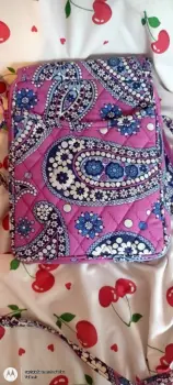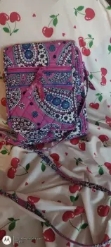 Cartera rosa con asa para cruzar. Bolsito bandolera rosa paisley tiene un bolsillo central, un espacio para tarjeta, un bolsillo con cierre en la tapa y un bolsillo posterior