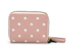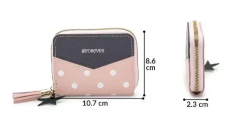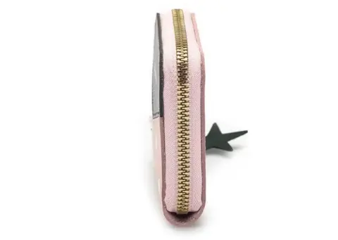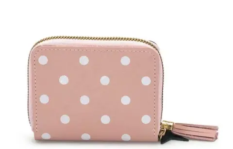 Es una pieza de color rosa, con bolitas blancas, así como detalles en gris, el compartimiento principal es cierre de cremallera, así como espacios suficientes para que puedas colocar tus tarjetas, identicifaciones y billetes de manera segura, cuenta con una motita y estrella colgante. Esta elaborado en materiales 100% sintéticos.