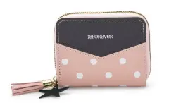 Cartera Rosa marca 18 Forever para Mujer. Es una pieza de color rosa, con bolitas blancas, así como detalles en gris, el compartimiento principal es cierre de cremallera, así como espacios suficientes para que puedas colocar tus tarjetas, identicifaciones y billetes de manera segura, cuenta con una motita y estrella colgante. Esta elaborado en materiales 100% sintéticos.