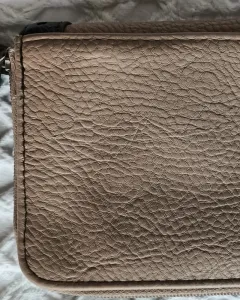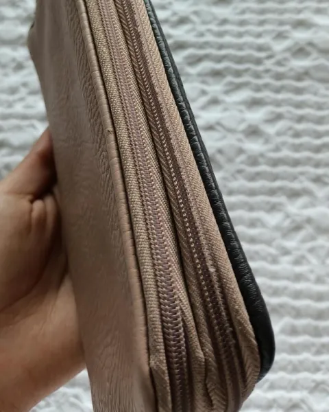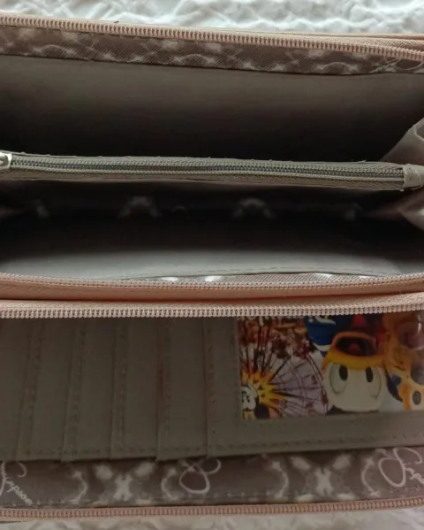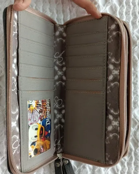Cartera rosa palo con gris. Tamaño normal, de lo ancho caben los billetes americanos, los mexicanos caben más que bienTiene dos cierres, mucho espacioPuedes meter muchas tarjetasEsta hecho de piel sintética