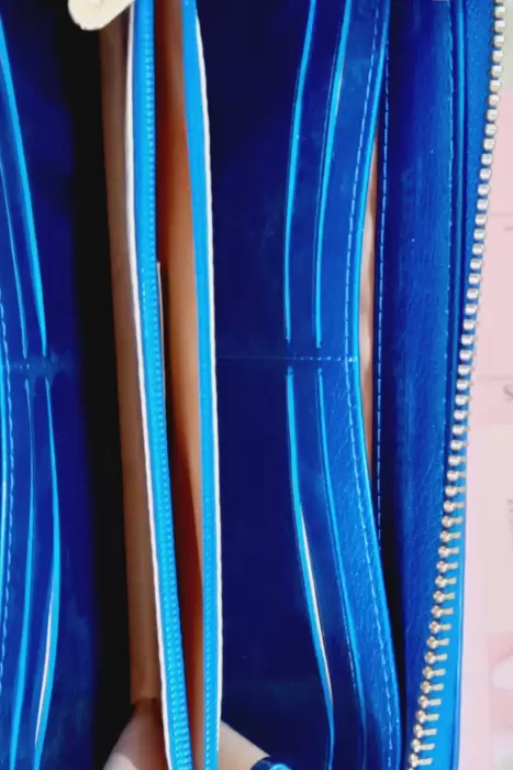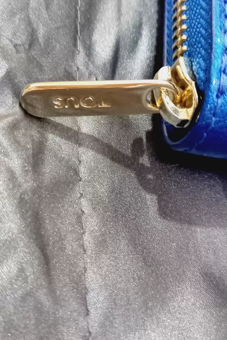 Billetero mediano TOUS Dorp de vinilo efecto charol en color azul. Interior: ocho departamentos para tarjetas, un departamento con cremallera y cuatro departamentos para varios. Medidas: 11x19,5x2 cm.Envío con cubrepolvos y copia de orden de compra.