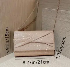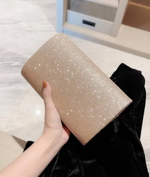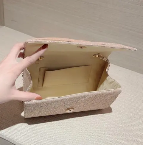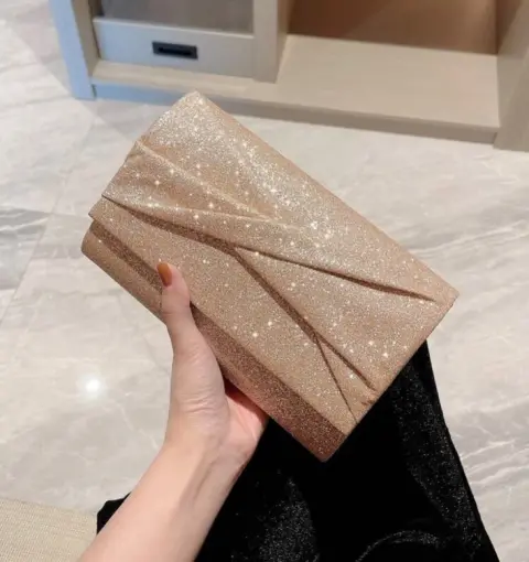 Linda cartera Wallet dorada glitter, sin detalles de uso, medidas 21x15, con forro tipo satin