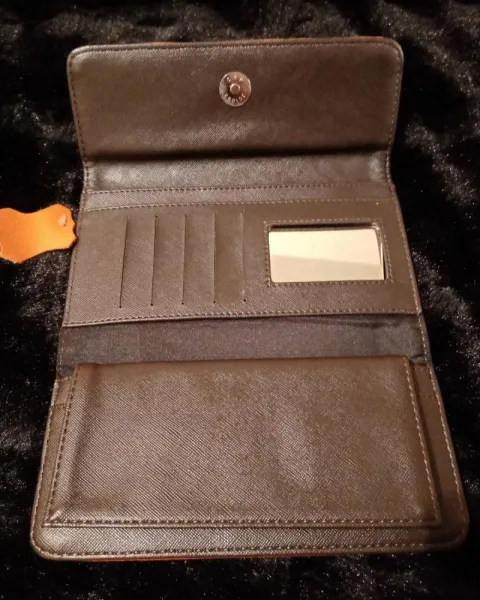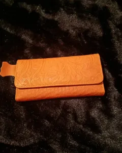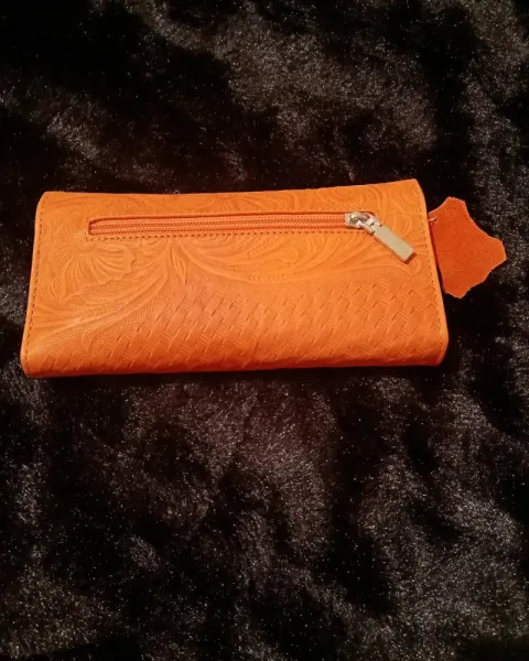 Hermosa cartera color naranja, de piel 100% de vacuno, ultimo precio, cuenta con espejo y compartimento para tarjetas, billetes y en la parte de atrás para monedas.