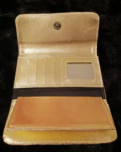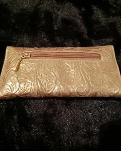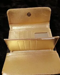 Hermosa cartera 100% piel de vacuno, dorada nueva, con compartimento para tarjetas, billetes, monedas, ultimo precio.