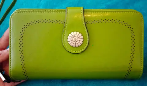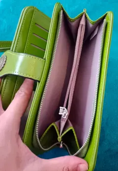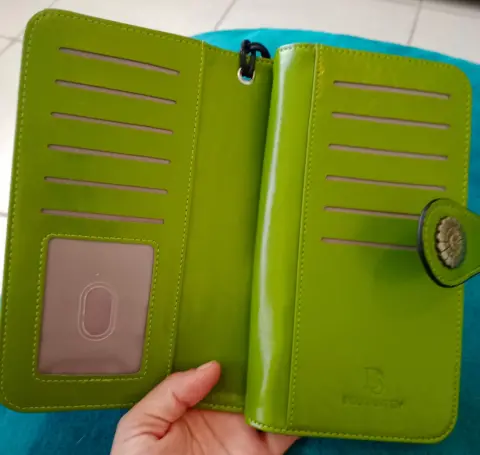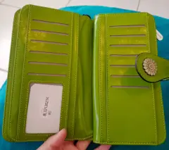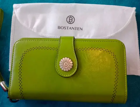 Hermosa cartera verde de piel marca BOSTANTENEs súper espaciosa, tiene 25 compartimientos para tarjetas.El color está bello!Lista para usarse y cuenta con su jareta para llevar en la muñeca.Mide 20cm de largo x 11 cm de ancho