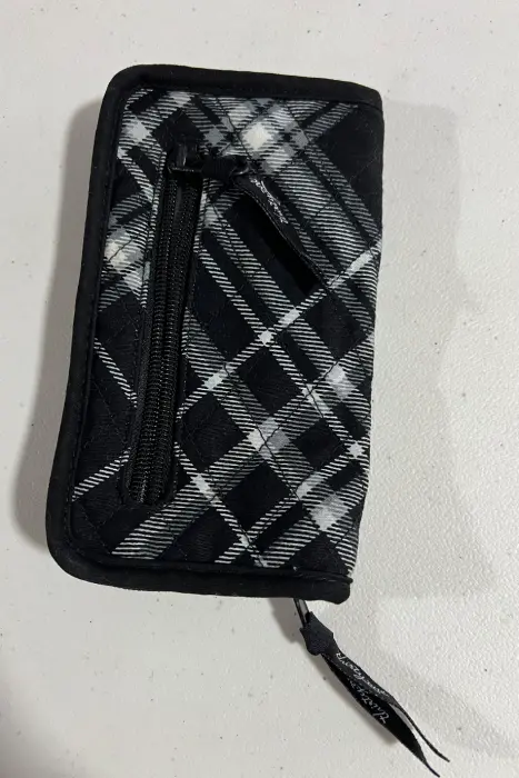 Tarjetero de cuadros. Tarjetero con cierre Thirty-One. Tejido de algodón a cuadros blanco y negro. Bolsillo exterior con cremallera para el cambio. Ranura especial para INE y varias ranuras para tarjetas de crédito. También se puede almacenar dinero en efectivo.Medidas 17 x 10 cm.