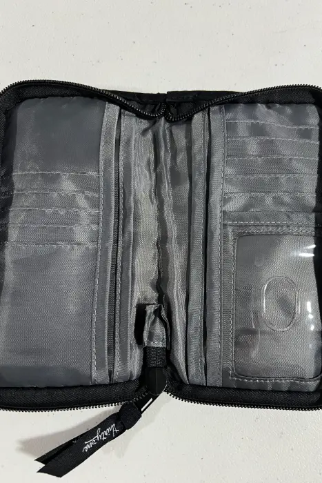 Tarjetero con cierre Thirty-One. Tejido de algodón a cuadros blanco y negro. Bolsillo exterior con cremallera para el cambio. Ranura especial para INE y varias ranuras para tarjetas de crédito. También se puede almacenar dinero en efectivo.Medidas 17 x 10 cm.