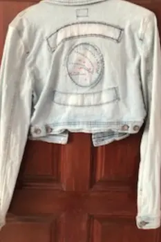 Chaleco. Chaleco corto azul de mezclilla, manga larga, talla 5, con detalle en la parte trasera