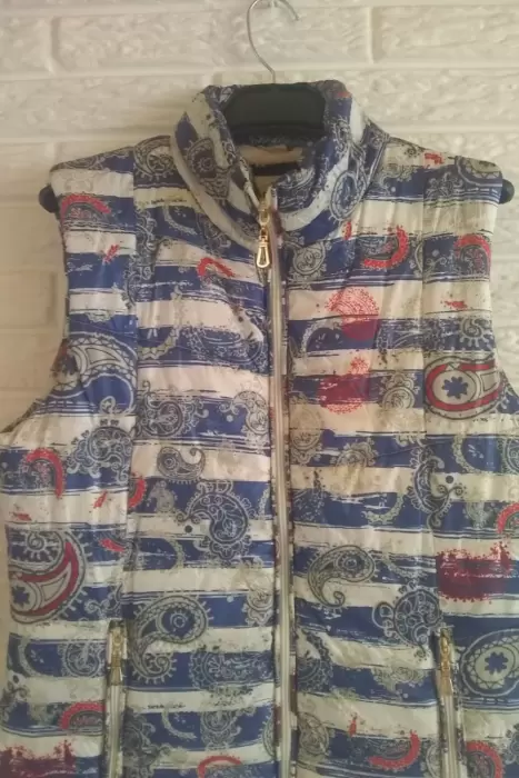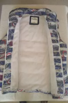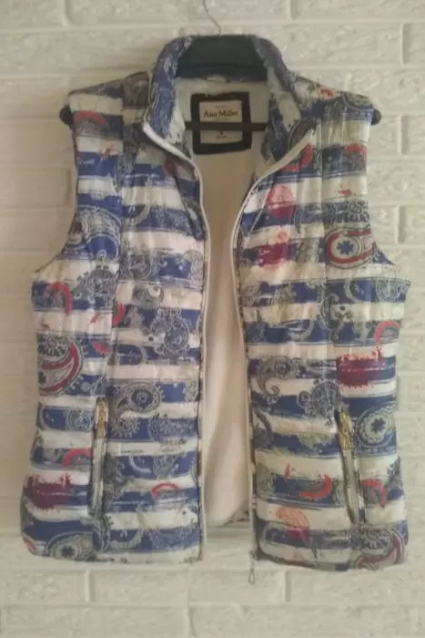 Chaleco acolchado de la marca Ann Miller, con cremallera completa, bolsillos al frente, en color azul marino con rojo, gris y blanco, forro polar en color blanco, talla G, exterior 100% poliéster, forro polar 100% poliéster, relleno 100% poliéster, lavado en casa, nuevo sin etiqueta. Precio regular en tienda $ 750.00 vendo en $ 400.00