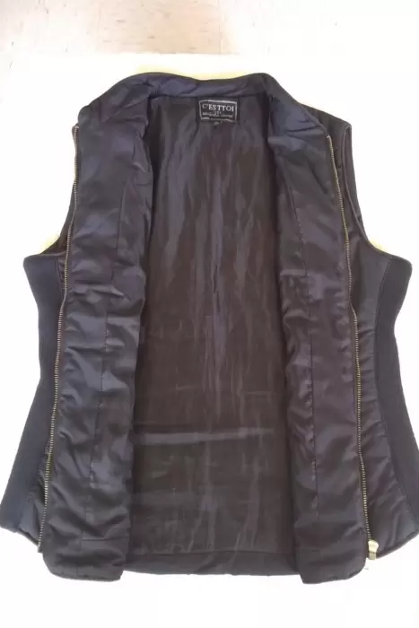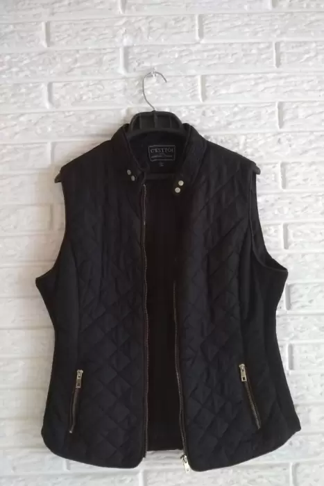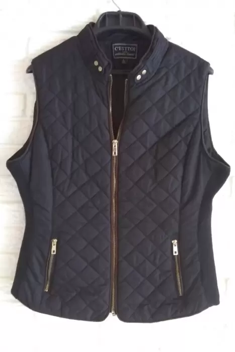 Chaleco acolchado de la marca C’Esttoi, cremallera completa, bolsillos al frente, en color negro, cuello mao, talla L, material ajustable en los costados, exterior 100% poliéster, forro 100% poliéster, relleno 100% poliéster, lavado en casa. Poco uso, en perfecto estado, sin detalles. Se entrega como aparece en las fotos. Precio regular en tienda $ 600.00 lo vendo en $ 300.00