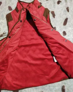 Hermoso chaleco, afelpado con terminados en gamuza café, tiene cierre para gorro (pero ya no lo tengo), está en buen estado, lo utilice una vez, con cierre y botones en la parte delantera, bolsas con botón.