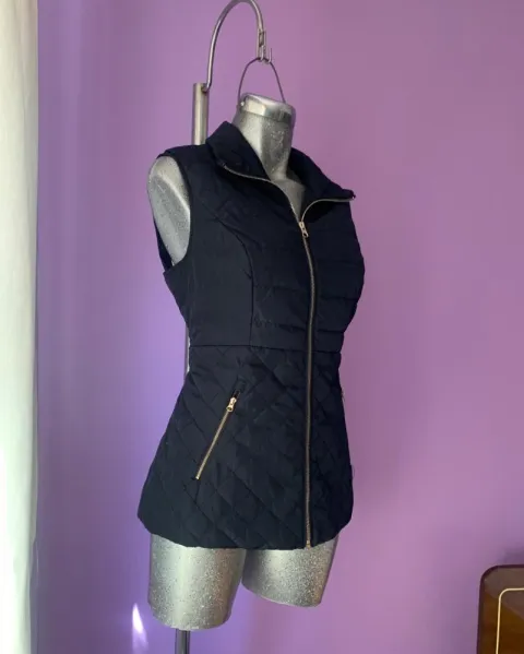 Hermoso chaleco largo, azul marino con forro calientito. Detalles con botones en la cintura, de la marca philosophy, le va bien a una talla chica o mediana.Sus medidas son: 68cm de largo, 80cm de cintura, 46cm de axila a axila.