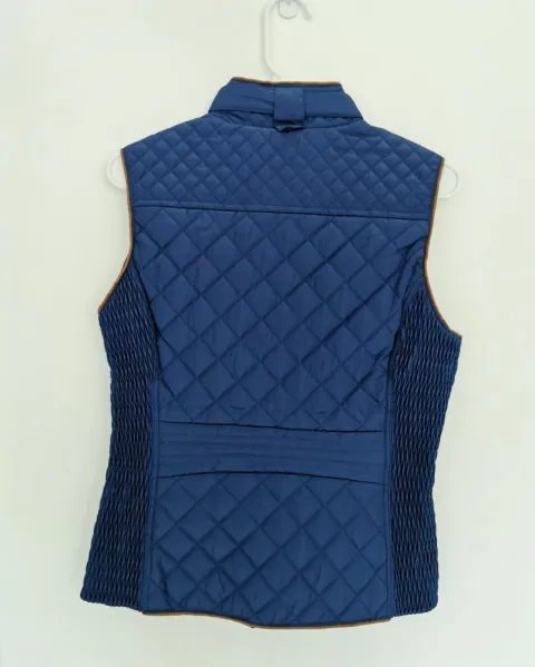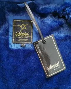 Chaleco azul Special One. Chaleco acolchado estilo capitonado de tela tipo raso. Forro de pelo muy calientito. Cuello mao con cinta y botones dorados. Los costados son elásticos. Bolsillos de jareta con siper para meter las manos. Los sipers de los bolsillos y el principal son dorados. Todo el chaleco tiene terminado en cuero. Talla S.