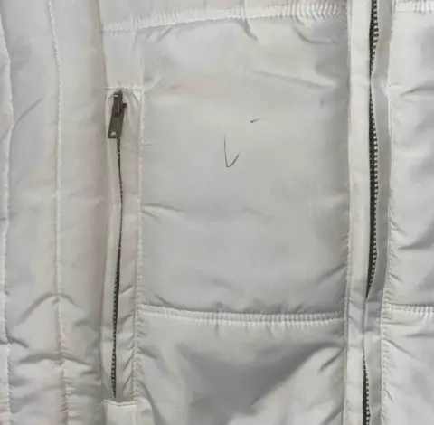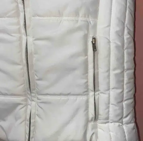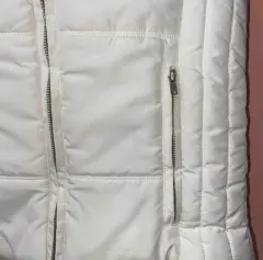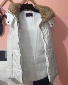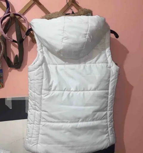 Chaleco color blanco, con gorro y borreguito en el cuello, tiene dos bolsas a los costados y cada una contiene cierre. Talla: S, súper bonito y calientito. Detalle: pequeño rayón con lapicero en la bolsa derecha.