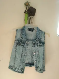 Chaleco sin mangas talla S,le queda a una chica de 12 a 16 años muy bonito comodo ahora que el verano está por llegar usarse con top☺️ bonito,está excelente y no tiene uso...