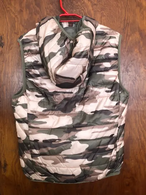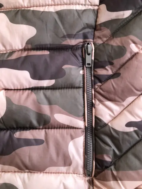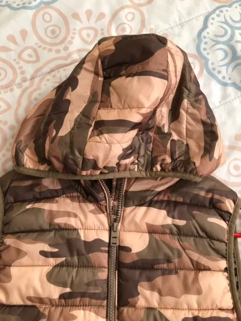 Chaleco camuflaje ligero. Súper ligero chaleco en camuflaje verde con rosa Tiene gorro y dos bolsasMedidas:Hombro 37cmAxila 45Cintura 43Largo 57