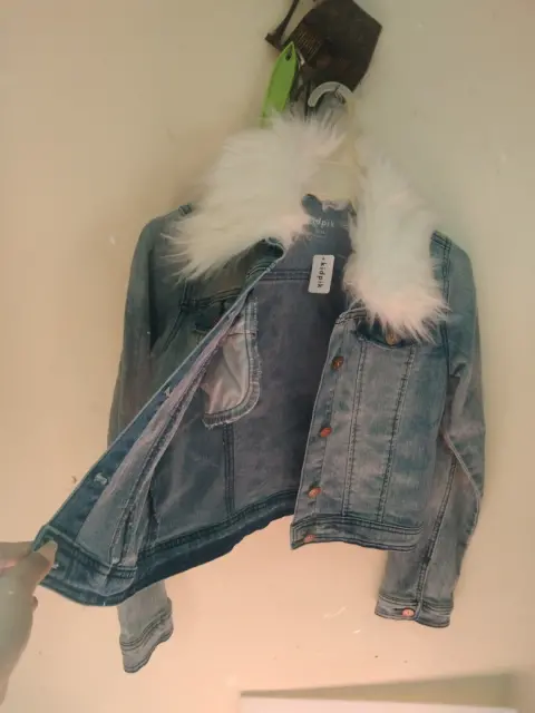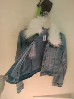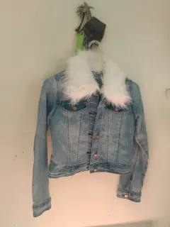 Chaleco con cuello de pelusa. Chaleco talla S,es streh,nuevo trai el cuello de pelusa le cada auna chica de 12 a 16 años muy bonito trai color pintito como blanco con azul.nuevo de mangas largas teai todos sus botones ,trai bolsitas