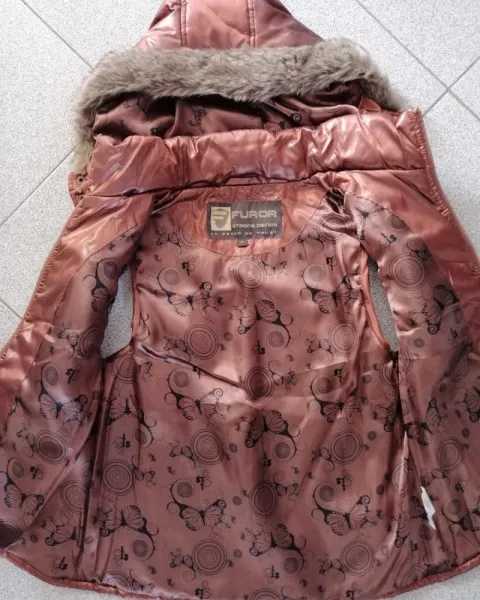 Chaleco con gorro color bronce Furor. Chaleco grande color bronce. Tiene 2 bolsas en el frente con broche, detalles de mariposa en la parte interior y tiene gorro con cierre, se puede quitar como se ve en la foto número cuatro.