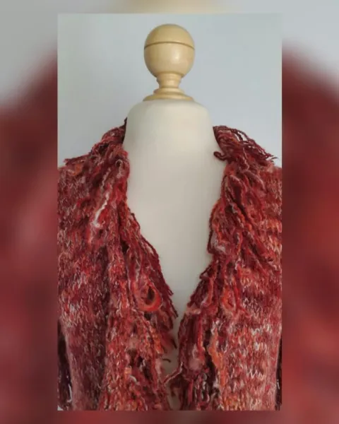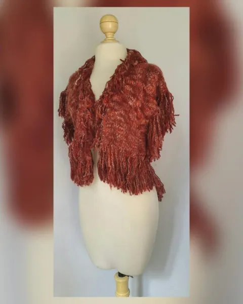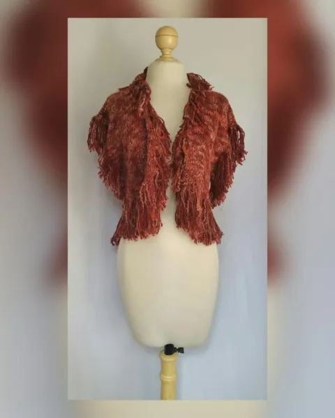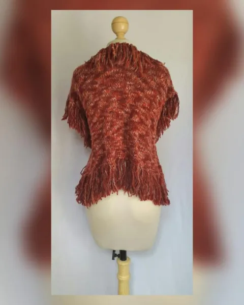 Chaleco Cropped Tejido de Punto Flecos. Chaleco cropped en tejido de punto en tonos ROJOS MARMOLEADOS, cuello pico, manga sisa y sin sistema de cierre. UNITALLA (da mejor a M/L). Dimensiones cms: 54 hombro, 58 axila, 60 zona baja, 46 largo frontal, 53 largo trasero. 100% acrílico. Para lavado en casa.