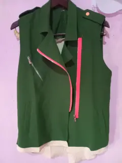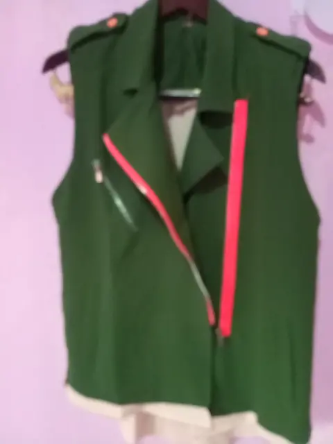 Chaleco dama, verde militar con vivos rosa neón, cierres y beige, muy bonito y original, talla G.