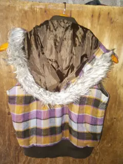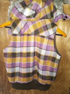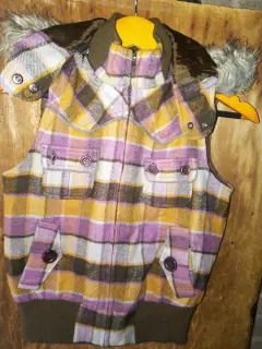Chaleco de cuadros. Chaleco en talla mediana en color café con rosa con bolsas a los lados, la gorra es desmontable usado y en buen estado