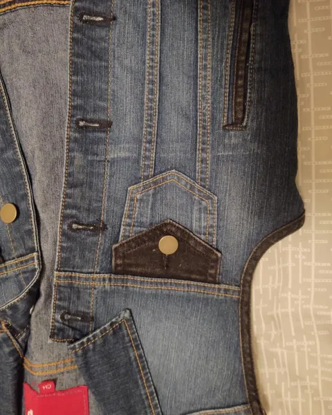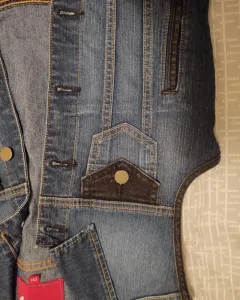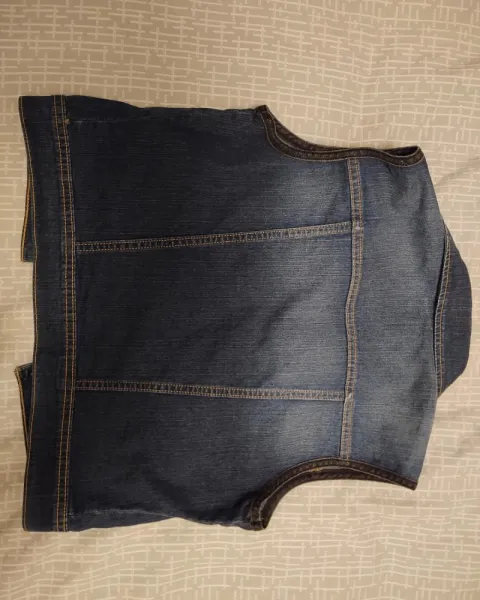 Chaleco de mezclilla deslavada, en las bolsas del frente la mezclilla es negra, al igual que en bolsas y orillas de axilas. Se encuentra en excelente estado.
