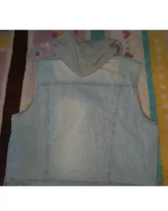 Chaleco de mezclilla azul claro, es cortito, tiene gorro color gris y esta en muy buen estado, cuenta con bolsas y botones