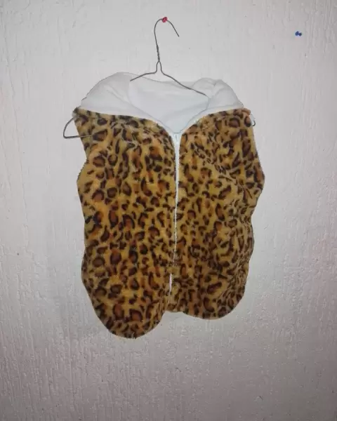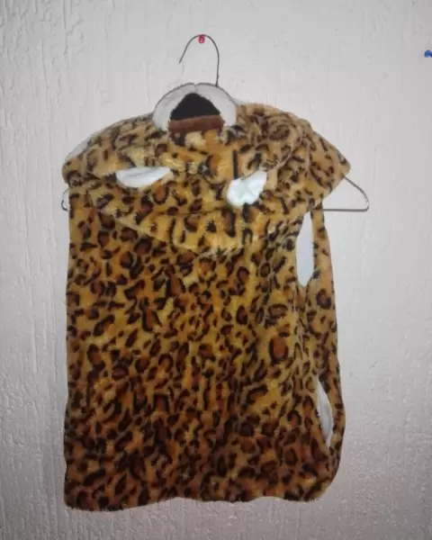 Es un chaleco de niña talla 10, en diseño animal print,ver peluche, tiene cierre y una capucha con diseño de cabecita de tigre.