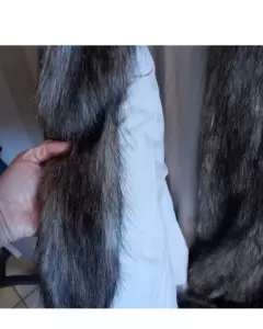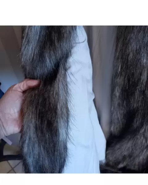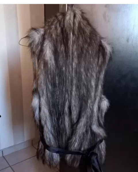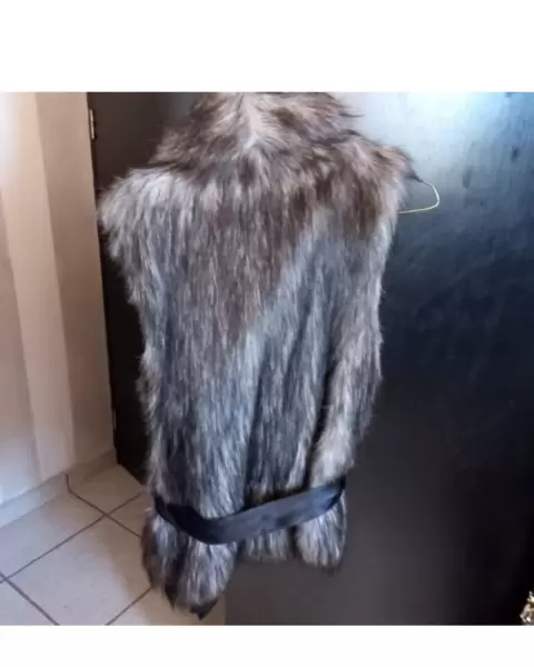 Chaleco de piel sintético. Chaleco de pelaje sintético, con forro y cinto negro de tela, marca C&A.