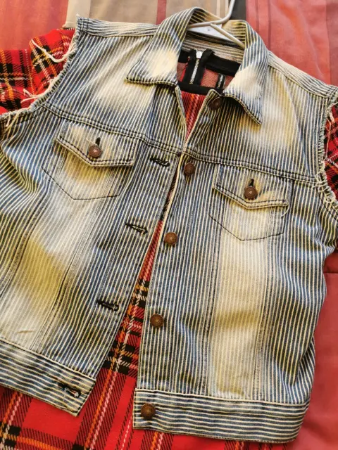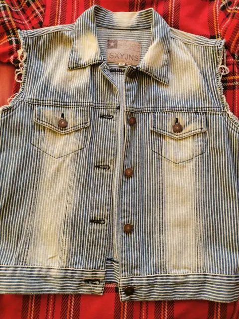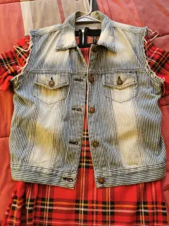 Chaleco denim estilo vintage, talla mediana, color azul marino en diferentes tonos✨