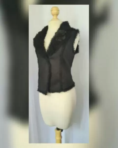 Chaleco efecto Ante. Chaleco efecto ante color NEGRO ÉBANO, cuello clásico c/solapas, cierre p/snap, aplique flor tela en solapa y aplique borreguillo sintético ligero en cuello y forro interior. Talla M. Dimensiones cms: 34 hombro, 48 axila, 46 cintura, 50 zona baja, 57 largo. 65% poliéster, 35% algodón. P/lavado en seco.