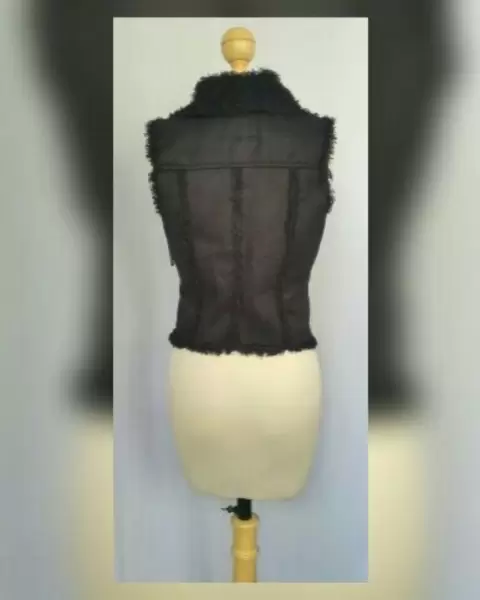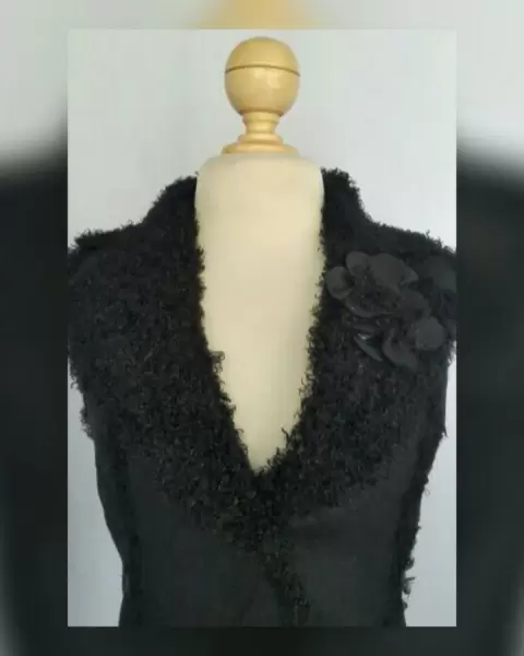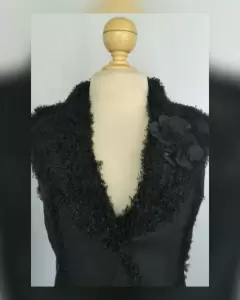 Chaleco efecto ante color NEGRO ÉBANO, cuello clásico c/solapas, cierre p/snap, aplique flor tela en solapa y aplique borreguillo sintético ligero en cuello y forro interior. Talla M. Dimensiones cms: 34 hombro, 48 axila, 46 cintura, 50 zona baja, 57 largo. 65% poliéster, 35% algodón. P/lavado en seco.