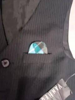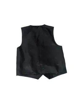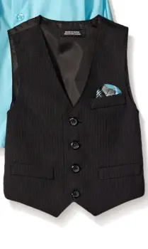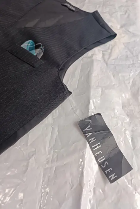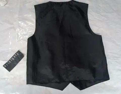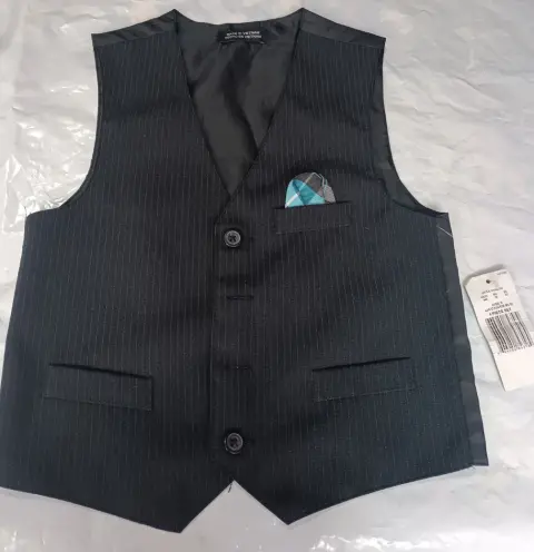 CHALECO FORMAL, MARCA VAN HEUSEN, TALLA 6 AÑ, 98 % POLIÉSTER 2% OTRA FIBRA, IMPORTADO DE VIETNAM,BOLSILLOS DE ADORNO,MIDE HOMBRO A HOMBRO 27.5 CM, 35.5 CM DE AXILA A AXILA, LARGO 41.5 CM, COLOR NEGRO CON RAYAS GRIS