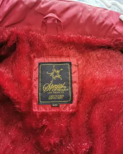 Chaleco guinda Special One. Chaleco acolchado estilo capitonado de tela tipo raso. Forro de pelo muy calientito. Cuello mao con cinta y botones dorados. Los costados son elásticos. Bolsillos de jareta con siper para meter las manos. Los sipers de los bolsillos y el principal son dorados. Todo el chaleco tiene terminado en cuero. Talla S.