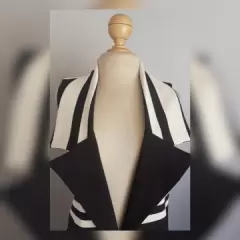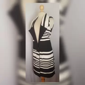 Chaleco Largo Bitono. Chaleco largo bitono BLANCO MARFIL/NEGRO ÉBANO, cuello clásico c/solapas muesca, manga sisa, cierre p/botonadura y 2 bolsos frontales plastrón. Talla CH (AMPLIO, da mejor a M). Dimensiones cms: 37 hombro, 49 axila, 49 cintura, 52 zona baja, 99 largo. 67% viscosa, 29 poliéster, 4% elastano. Para lavado en casa.***HECHO EN ITALIA***POR LA COMPOSICIÓN DE LA TELA, DA DE SI UN POCO***