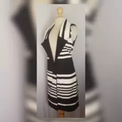 Chaleco largo bitono BLANCO MARFIL/NEGRO ÉBANO, cuello clásico c/solapas muesca, manga sisa, cierre p/botonadura y 2 bolsos frontales plastrón. Talla CH (AMPLIO, da mejor a M). Dimensiones cms: 37 hombro, 49 axila, 49 cintura, 52 zona baja, 99 largo. 67% viscosa, 29 poliéster, 4% elastano. Para lavado en casa.***HECHO EN ITALIA***POR LA COMPOSICIÓN DE LA TELA, DA DE SI UN POCO***