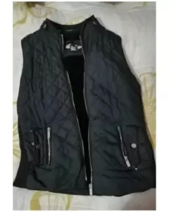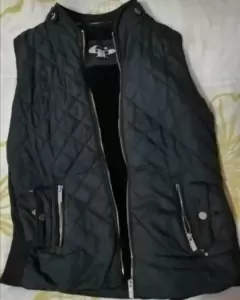 Chaleco negro calentito. Bonito chaleco, calentito, tiene felpa por dentro, se abrió un poquito de la bolsa pero es mínimo, lo demás esta perfecto tiene plicaciones metálicas ajusta muy bien al cuerpo,