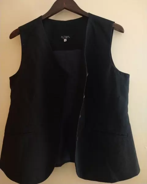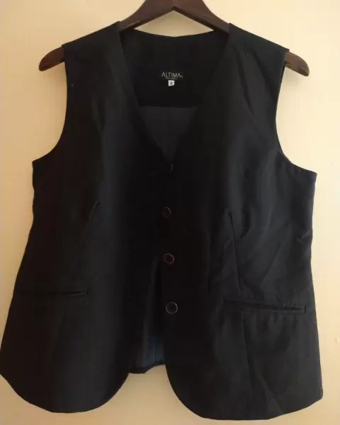 Chaleco Negro marca Altima. Chaleco Altima color negro con forro azul marino con bolsas, la talla es 8. Es de estilo de vestir para eventos u ocasiones formales, entrevistas de trabajo, trabajos que requieren buena presentación, etc. La tela no es áspera pero tampoco muy suave, es blanda medianamente, 65% poliéster, 35% algodón.