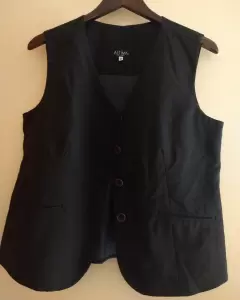 Chaleco Altima color negro con forro azul marino con bolsas, la talla es 8. Es de estilo de vestir para eventos u ocasiones formales, entrevistas de trabajo, trabajos que requieren buena presentación, etc. La tela no es áspera pero tampoco muy suave, es blanda medianamente, 65% poliéster, 35% algodón.