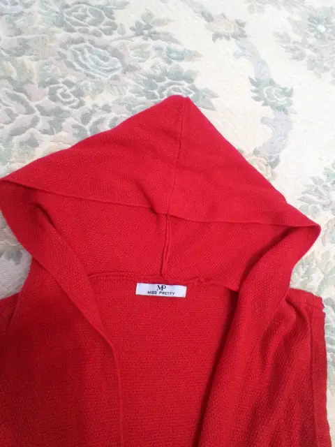 Chaleco Rojo Unitalla. Versátil y lindo chaleco color Rojo quemado, con gorro y cinta de ajuste en la cintura. Tejido, no de tela. Tiene bolsas al frente. Unitalla. Nuevo sin etiqueta