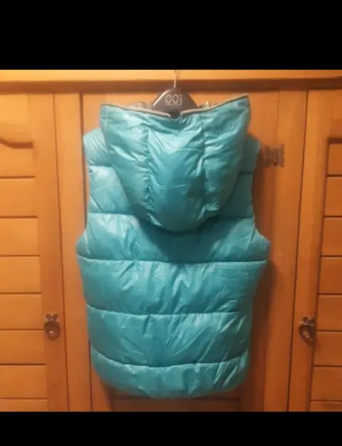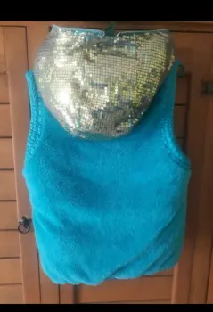 Chaleco talla Mediana, color verde agua, cierre alfrente, cierres en bolsillos laterales, goero con lentejuela dorada, afelpado interior, esta super padre tiene una puesta esta en perfecto estado y limpio.