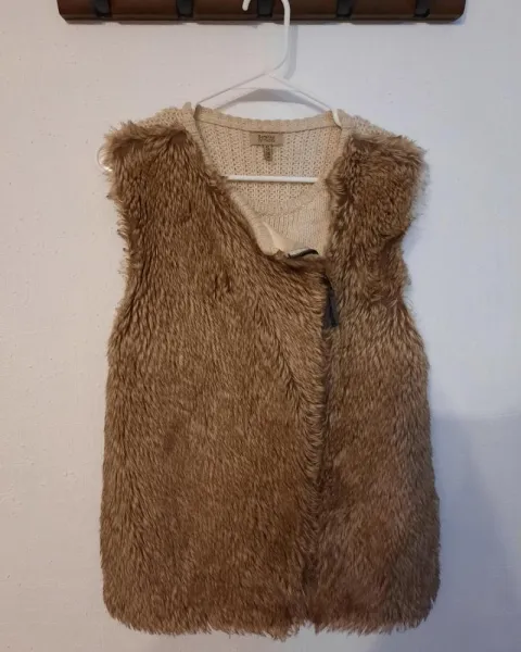 Chaleco tejido café talla S con peluche en la parte delantera, cuenta con cierre y botones en la parte de abajo y arriba, es ligero de utilizar, se ocupo muy pocas veces