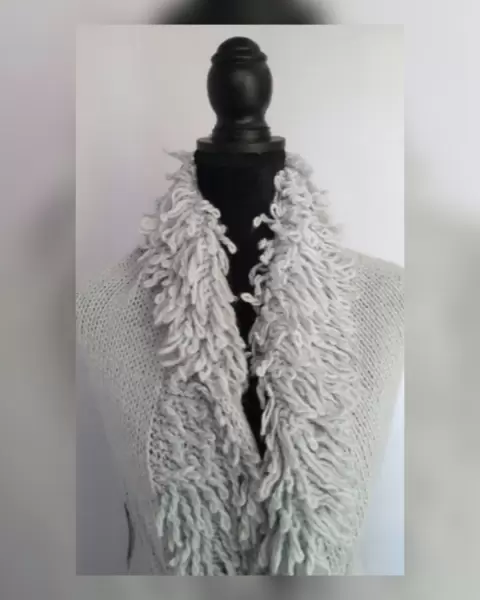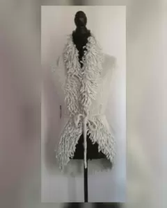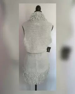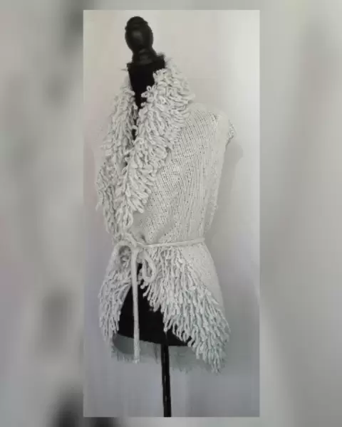 Chaleco en tejido de punto color AZUL GRISACEO, flecos zona cuello, frontal y espalda, cuello pico, manga sisa y cinturón mismo tejido p/mejor ajuste. Talla M. Dimensiones cms: 43 hombro, 62 axila, 43 cintura, 38 zona baja, 74 largo. 75% acrílico, 10% lana, 10% viscosa, 5% alpaca. P/lavado en casa.***HECHO EN ITALIA***