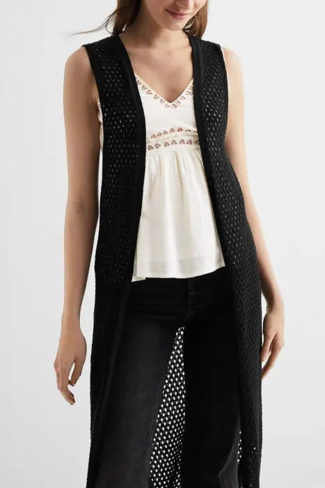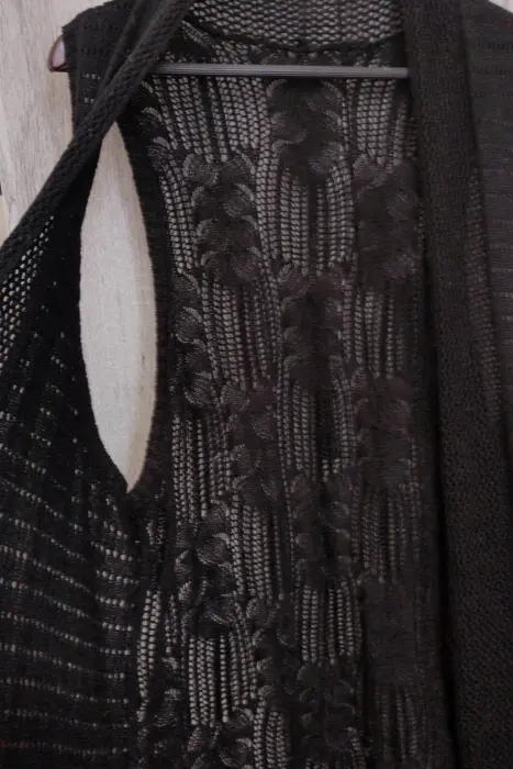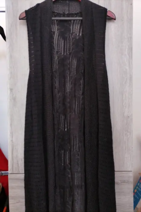 Ensamble largo tejido. Precioso ensamble chaleco largoTejido suave, no pesado ni tieso.No viene par auna talla en específico pese a eso por la amplitud del lado de los brazos su uso sugerido es para talla L-XL.