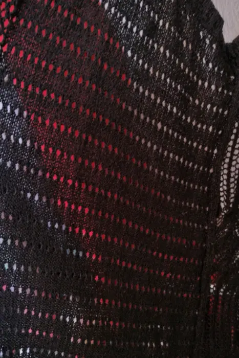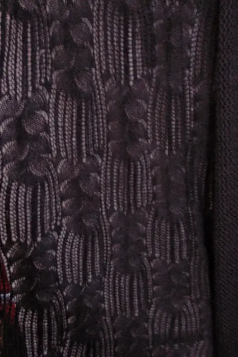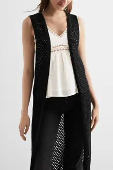 Precioso ensamble chaleco largoTejido suave, no pesado ni tieso.No viene par auna talla en específico pese a eso por la amplitud del lado de los brazos su uso sugerido es para talla L-XL.