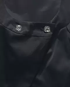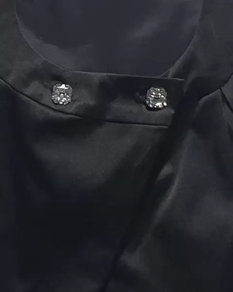 Chaleco de vestir negro, tela satinada, talla 5 Tiene 2 botones de brillante.