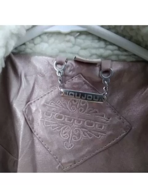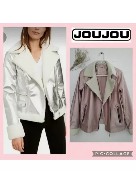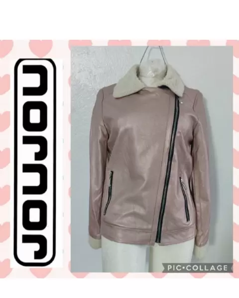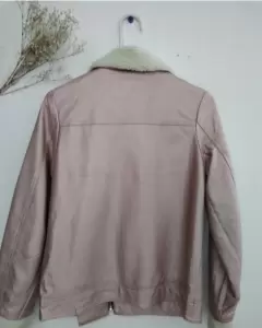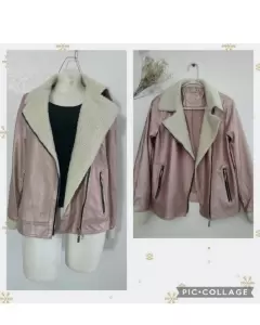 Hermosa biker jacket, color rosa palo metálica, 100% polyester, tipo piel, queda bien para una talla S/M. Mide de axila a axila: 48 cm, largo: 59 cm. Sin detalles.En perfecto estado. Bien cuidada.