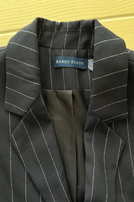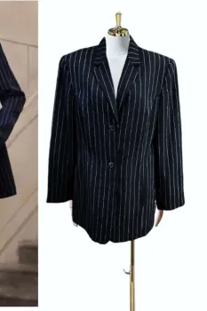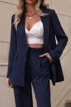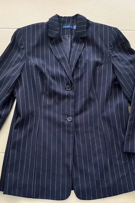 Blazer azul con rayas blancas diseño con 2 botones al frente con bolsillos ocultos, tela poliester, con hombreras.Medidas:Hombro a hombro: 47 cmAxila a axila: 66 cmLargo: 81 cm
